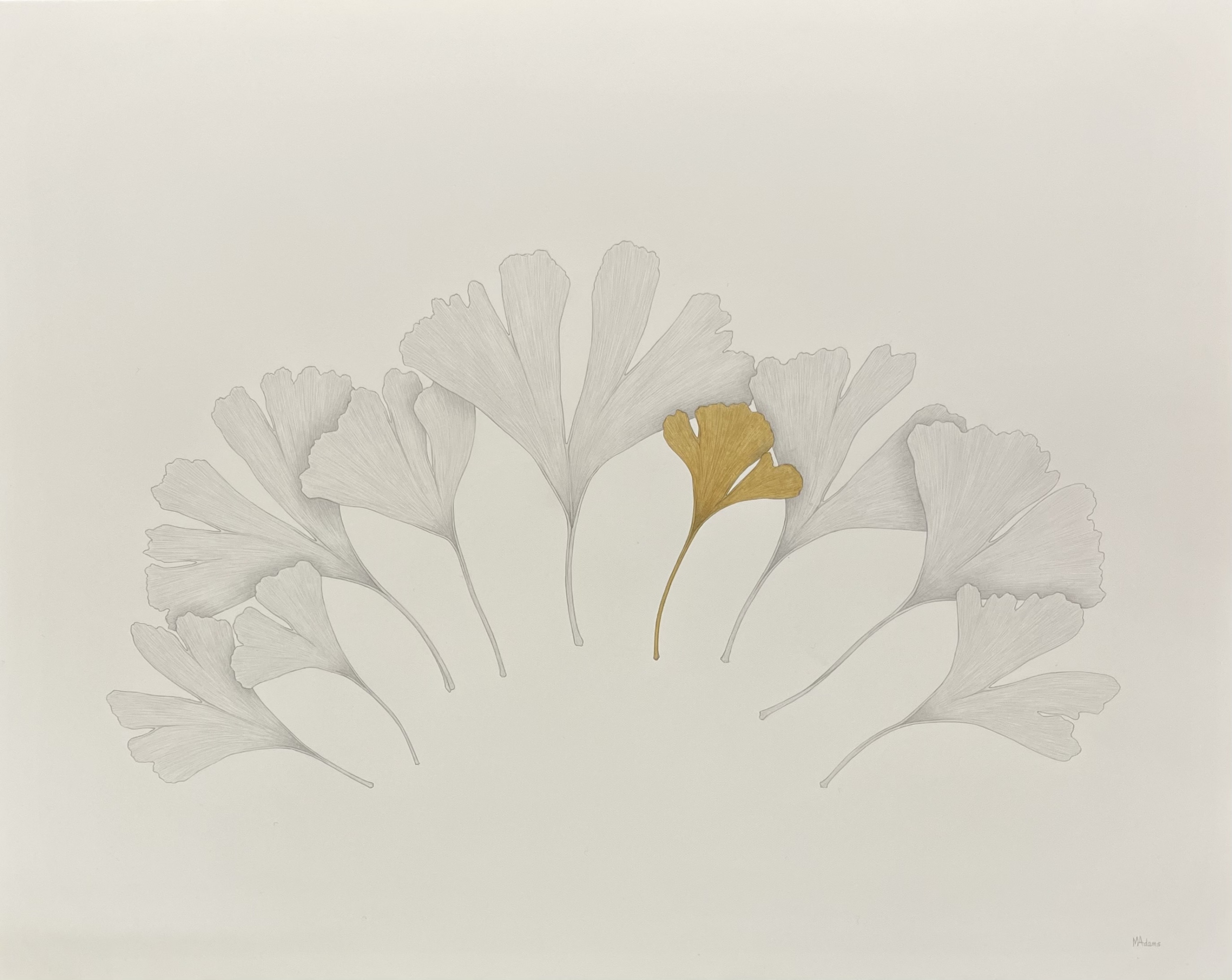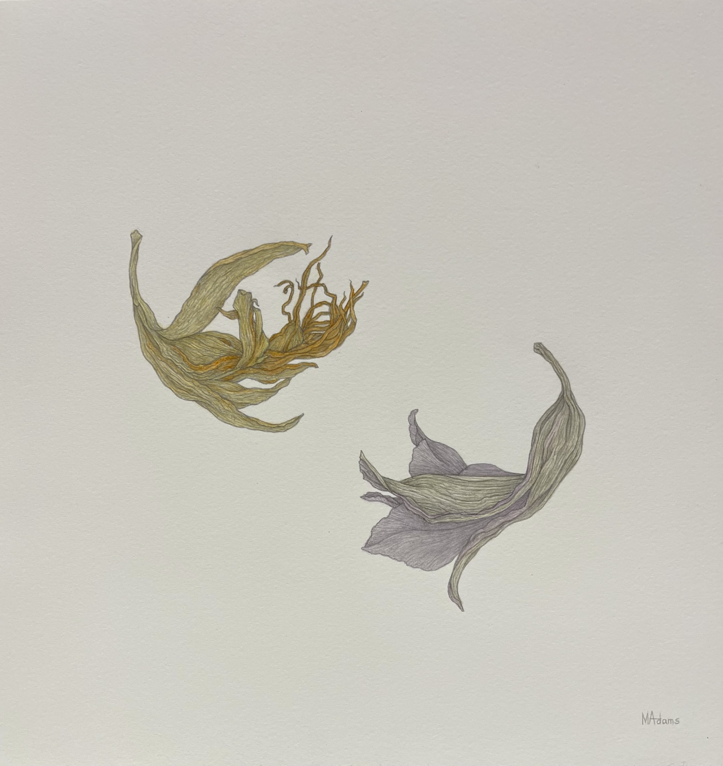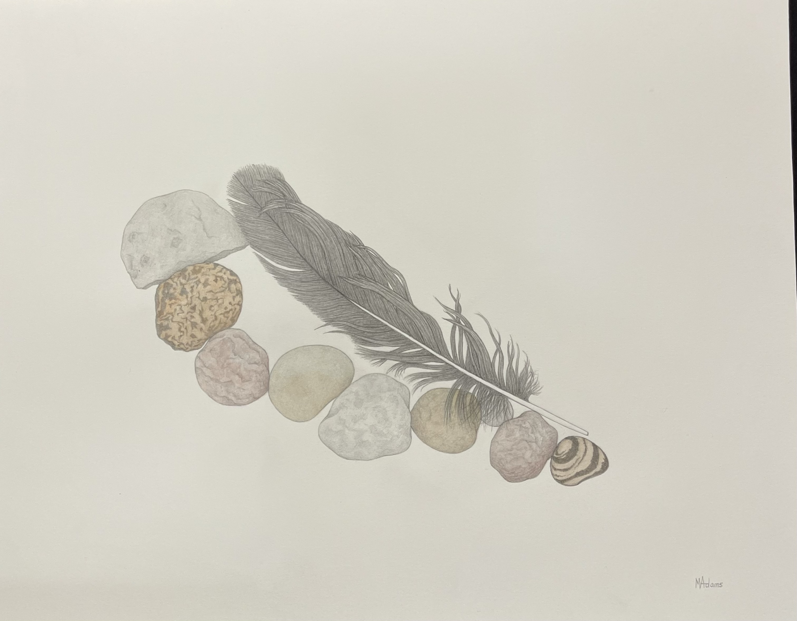 Miriam Adams works in graphite and watercolor on paper. It is a very direct technique, inherently simple, that allows a subtle play of line and color. The drawings are realistic in style, abstract in concept.